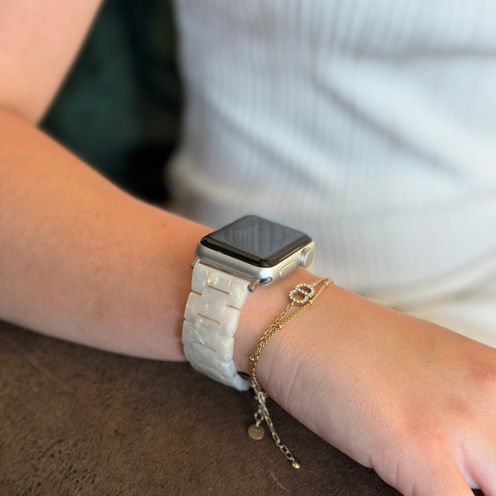 A close-up of an arm resting on a tabletop, adorned with the Luxe Iridescent Apple Watch Strap by Coconut Lane. Next to the watch is a delicate gold chain bracelet featuring a small charm. The person is wearing a white, sleeveless top.
