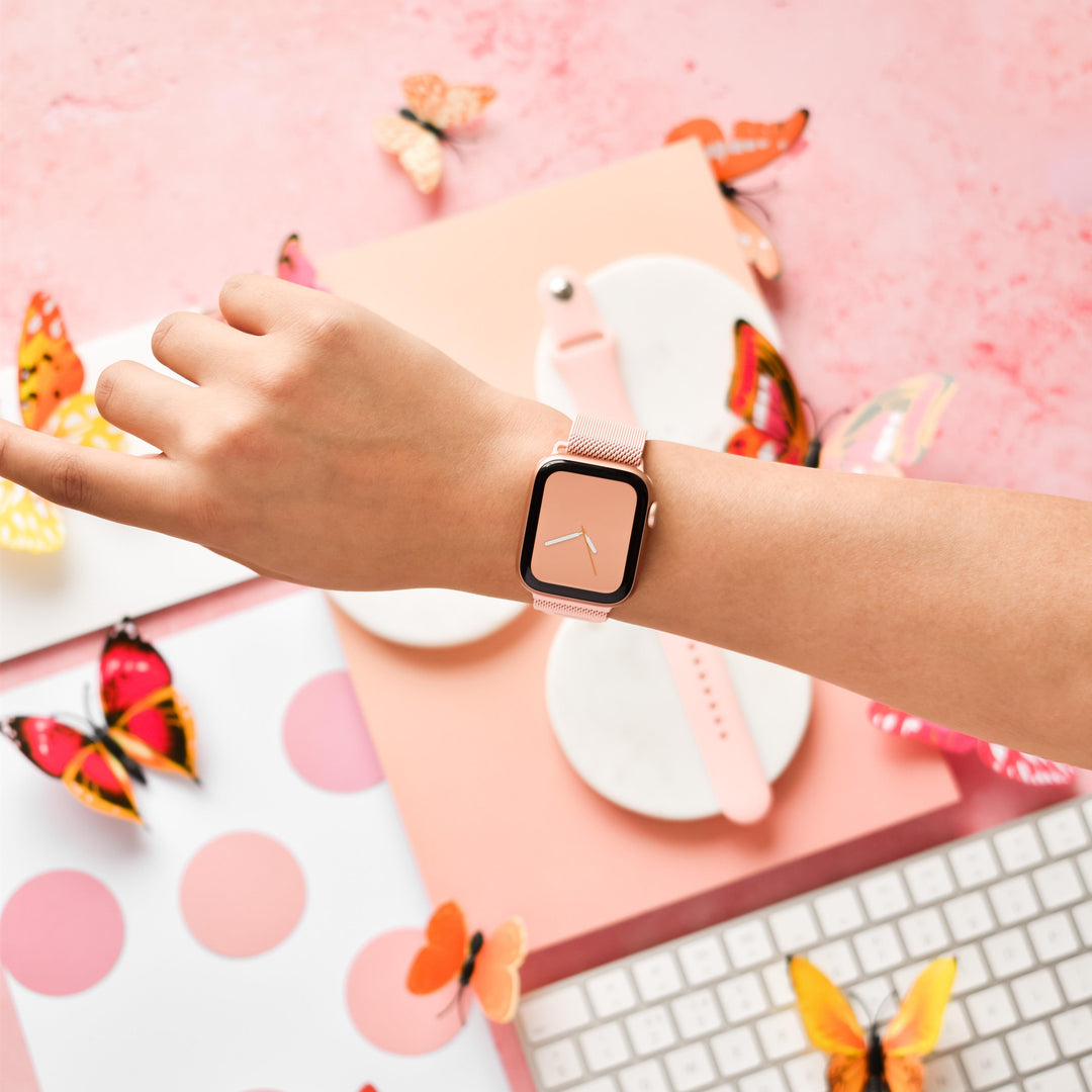 A person’s wrist is shown wearing a *Coconut Lane Magnetic Chain Apple Watch Strap in Coral Pink*. The background includes vibrant, colorful butterflies and various stationery on a pink surface, including polka dot paper, a white dish, and a keyboard. This stylish strap adds an elegant touch to the scene.