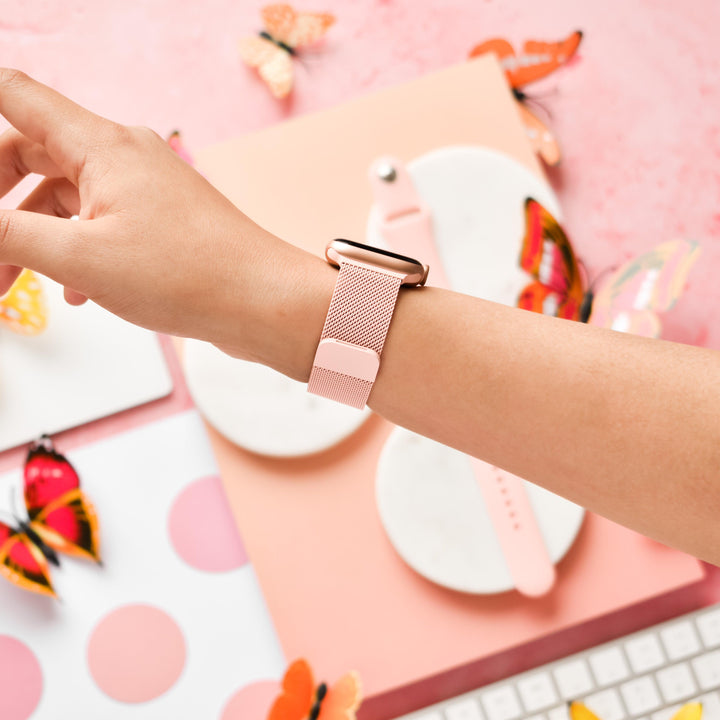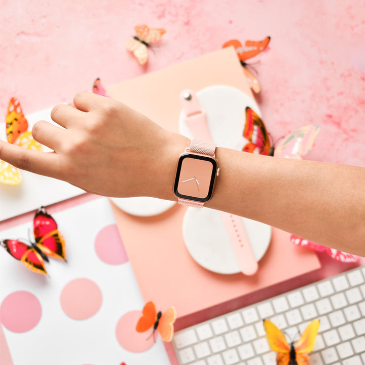 A hand wearing a Coral Pink Magnetic Chain Apple Watch Strap by Coconut Lane. The background includes colorful butterfly decorations, a pink polka dot notebook, another pink Apple Watch strap, and a portion of a keyboard. The scene is set against a soft pink surface.