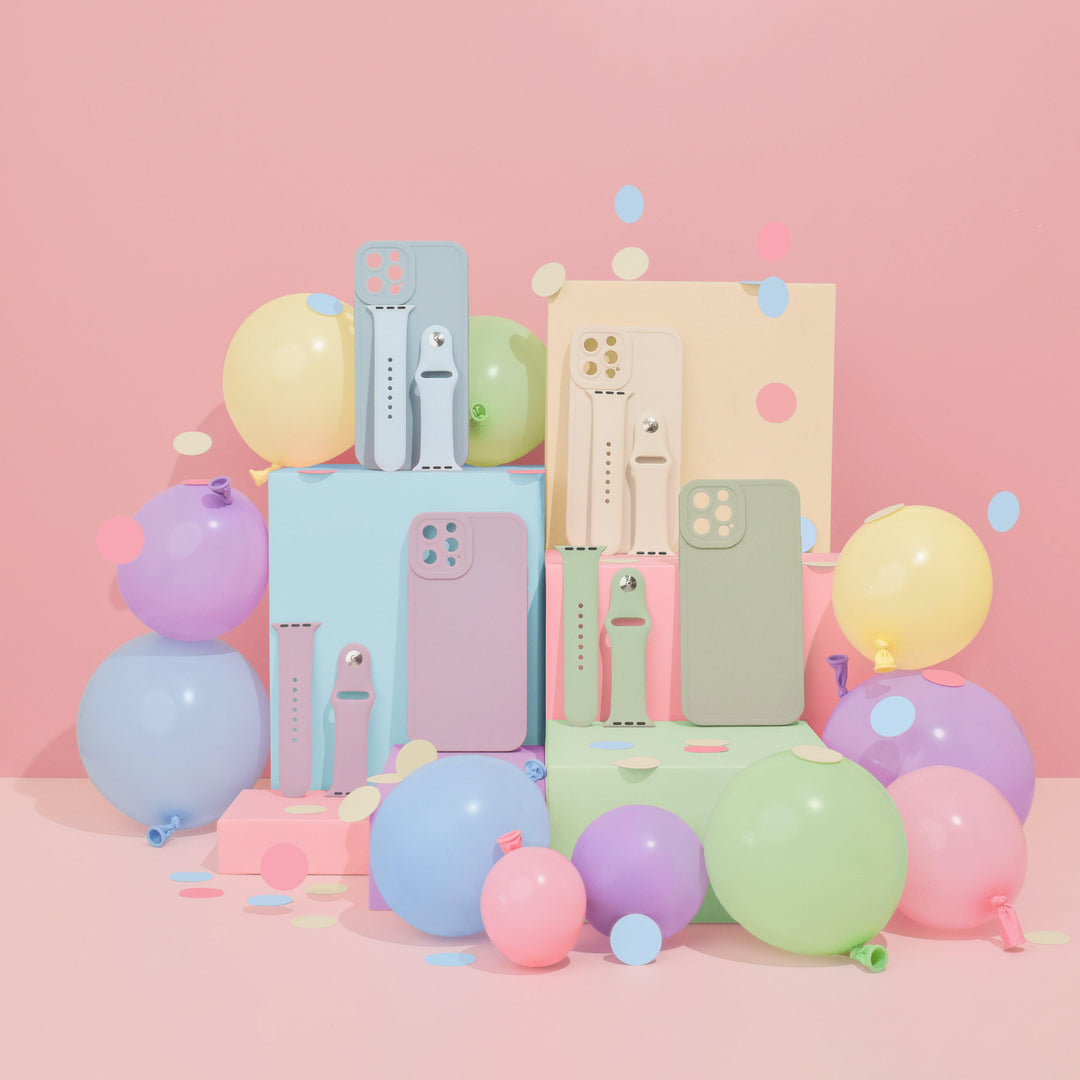 A vibrant and playful display features a colorful arrangement of pastel-colored phone cases and smartwatches, including the sleek NAKD Apple Watch Strap in Sage Green by Coconut Lane. The background is light pink with balloons in various pastel shades and scattered confetti, perfectly showcasing the accessories.