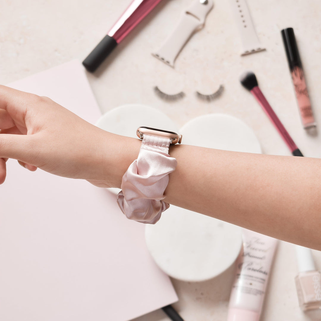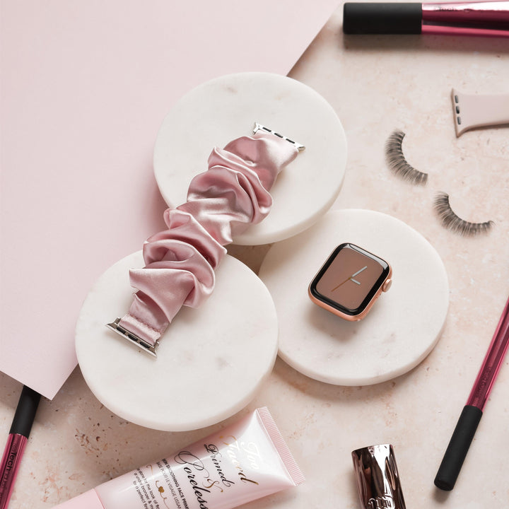 Our super cute Scrunchie Apple Watch Strap will have you blushing with compliments. This might just be the cutest Apple Watch accessory we've ever seen! Smooth, silky satin delivering ultimate comfort.