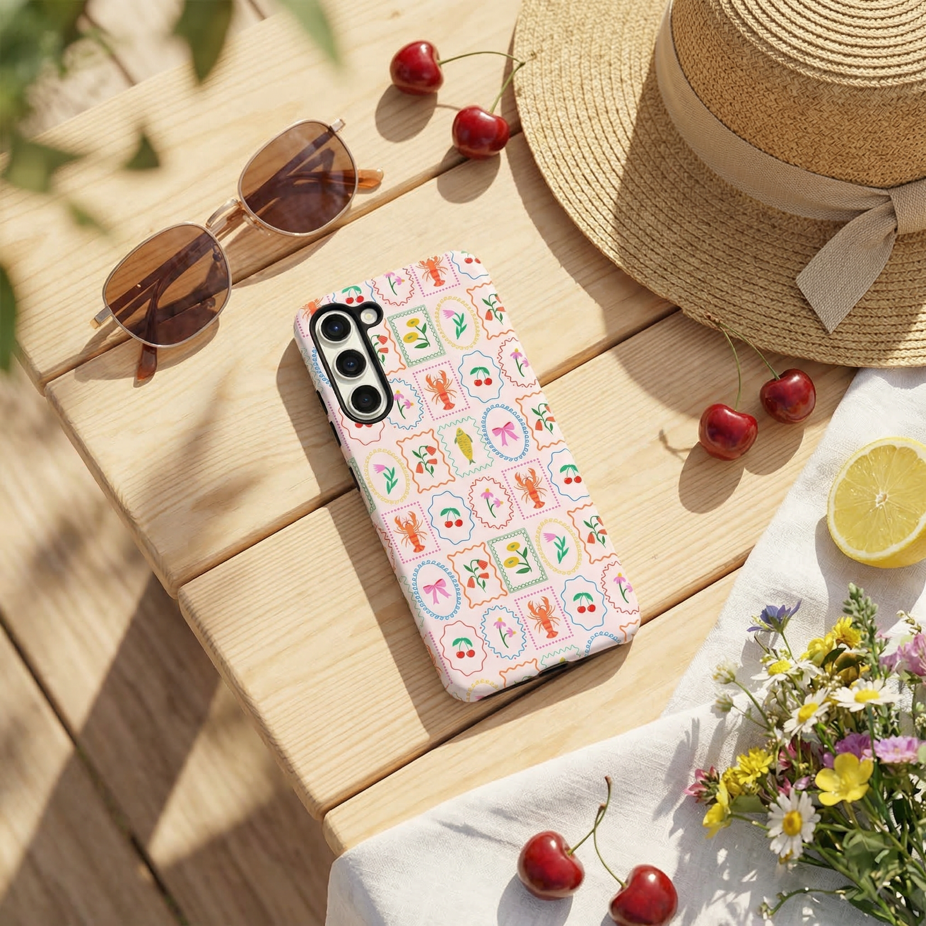 Samsung Tough Phone Case - Dolce Vita by Coconut Lane on a picnic table with sunglasses, hat, cherries, flowers and lemon slice.