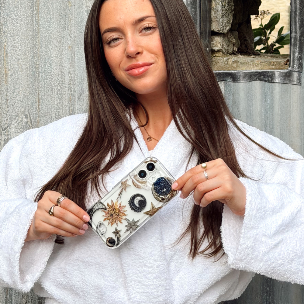 Girl in outdoor shower setting holding celestial phone case